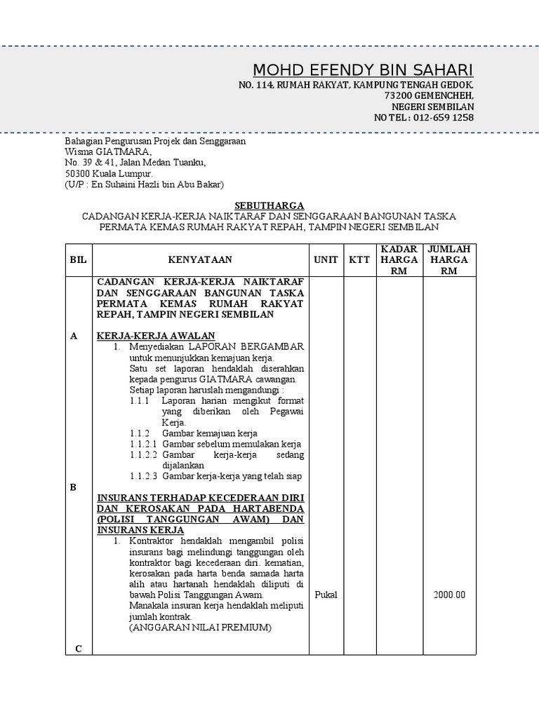 Jkh A Pdf Jadual Kadar Harga Huraian Bil Kadar Harga Rm A Kerja Kerja Permulaan Dan Persediaan Awalan A Polisi Insurans Tanggungan Awam Liabiliti Course Hero